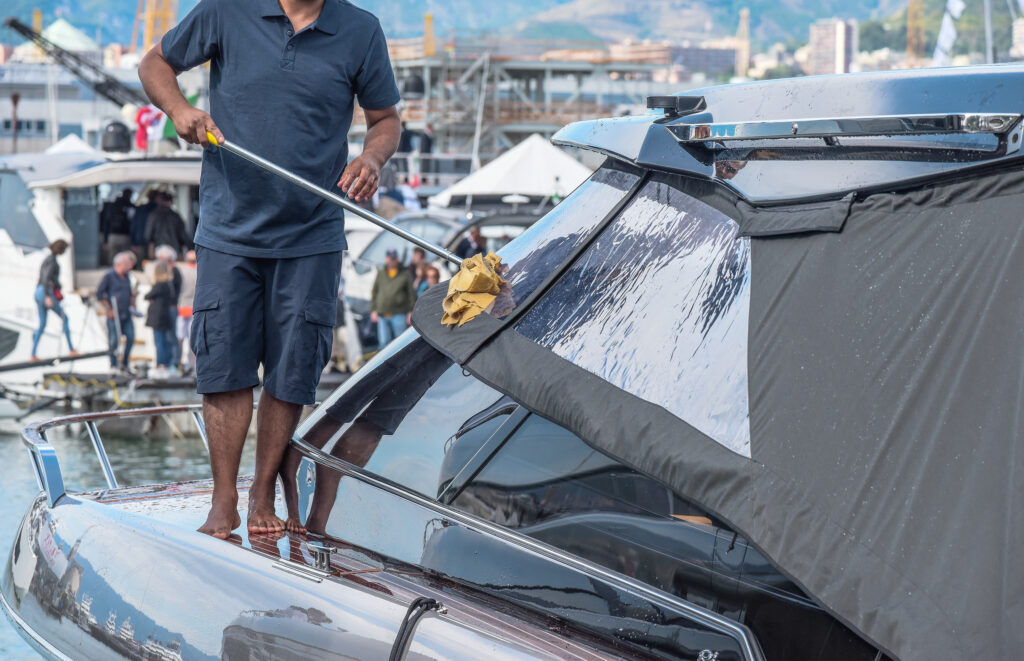 Pour un résultat impeccable, commencez toujours par le haut. Réalisez le nettoyage du pont avant celui de la coque afin de ne pas salir cette dernière une fois propre.